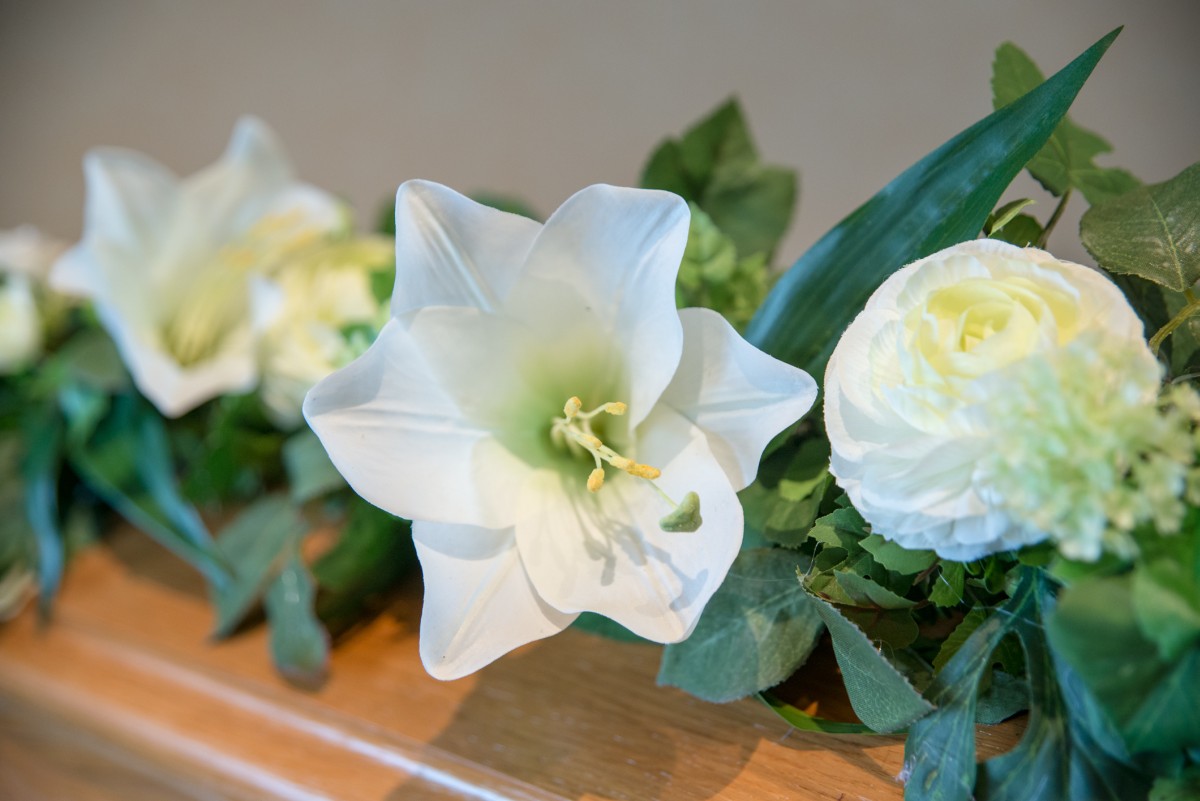 Feierliche Blumengestecke umrahmen eine Trauerfeier besonders würdevoll. Sie schmücken den Sarg oder die Urne auf liebevolle Weise.