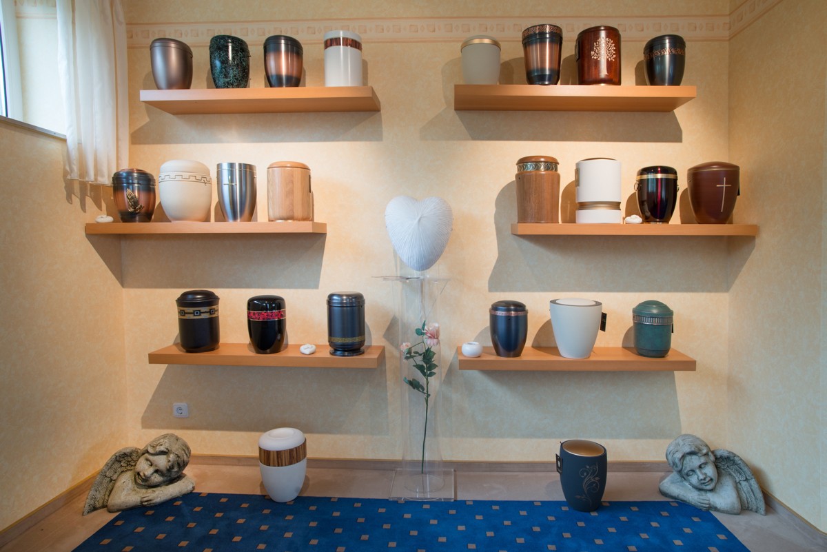 Wir haben ein großes Angebot an Särgen, Urnen und Sterbewäsche in unseren Ausstellungsräumen. Hier zeigen wir Ihnen Modelle von klassisch bis modern in verschiedenen Preisklassen. Auch Sonderanfertigungen geben wir nach Ihren Wünschen in Auftrag.
